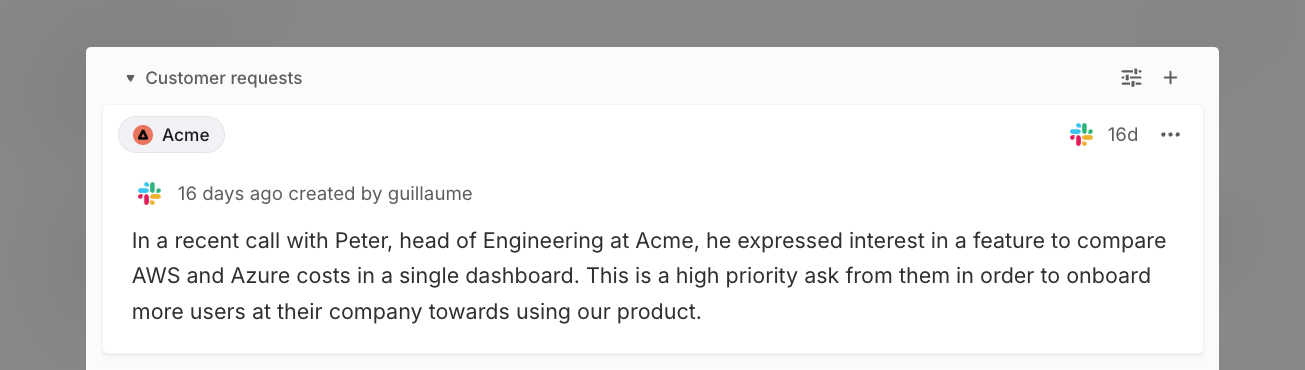 When an issue is created from integrations with Intercom, Zendesk, Front, or Asks, it will automatically add a request pointing back to the source. Requests can also be added manually and are viewable in their associated issue and the customer's page.