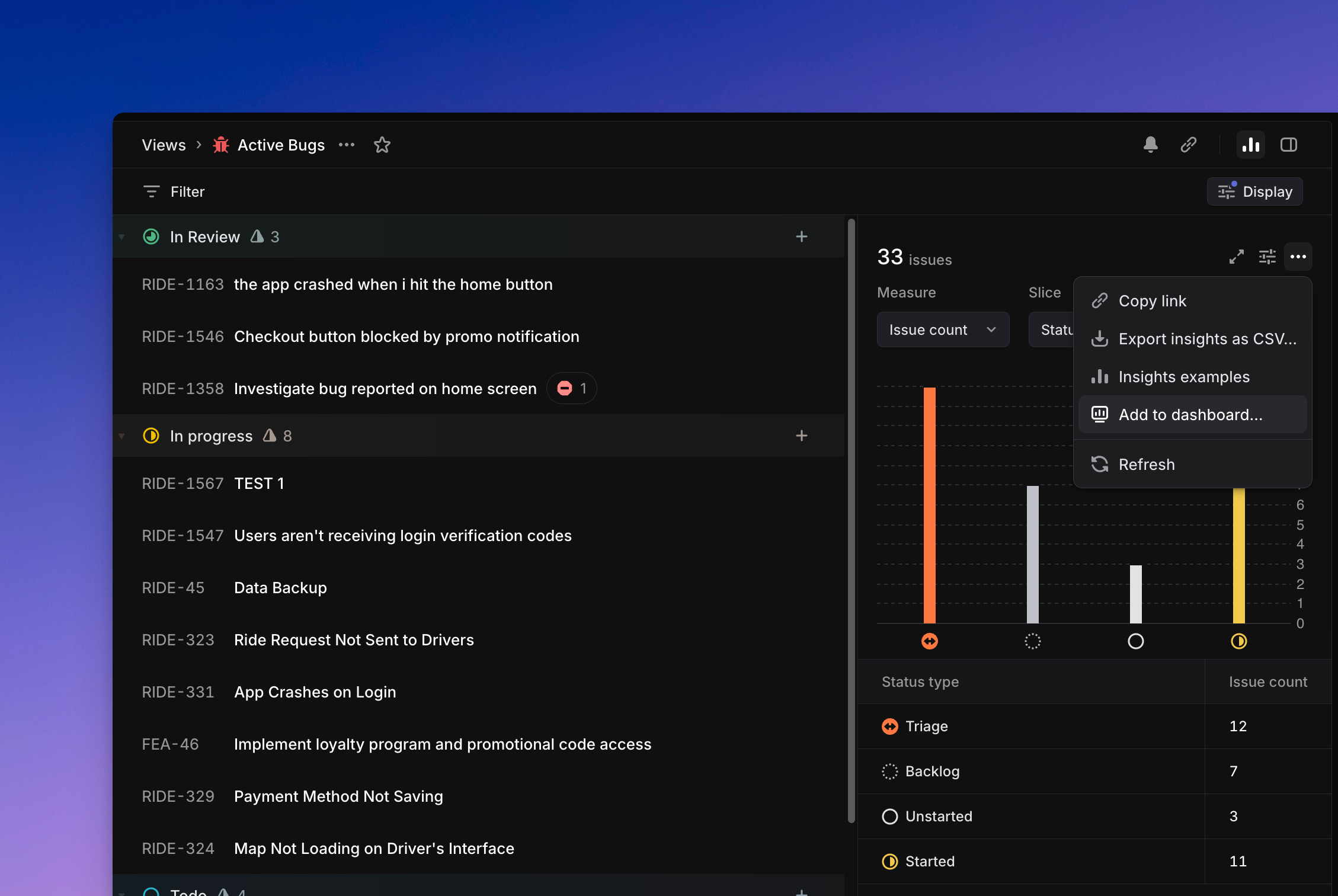 - Dashboard-level filters: When you create or edit a dashboard, you can set filters that apply globally to all insights in that dashboard. For example, if you filter for issues created by the “Design” team, every insight on that dashboard will reflect that filter automatically. You can configure multiple filters, and once the dashboard is saved, you can optionally hide these dashboard-level filters from view using the “saved filters” button to reduce visual clutter; this does not affect whether they apply.