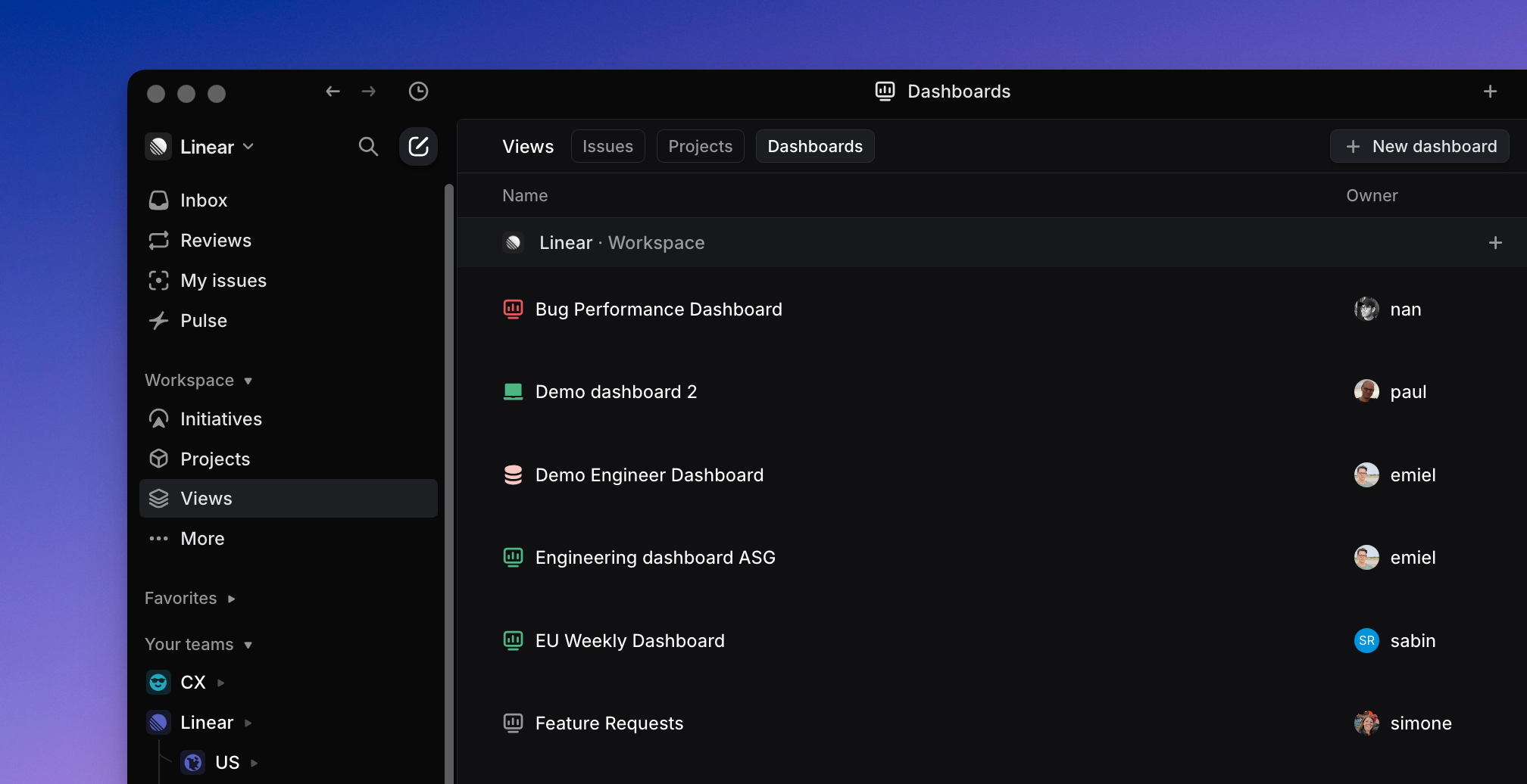 - From the Dashboards tab in the workspace Views page or a team’s Views page: Navigate to the Views page for your workspace or a team, select the Dashboards tab, and choose “New dashboard”.