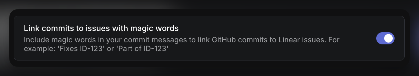 - Turn on the toggle for Link commits to issues with magic words at the bottom of the GitHub settings page.