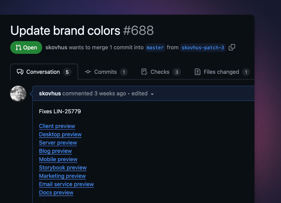 Links that end with "preview" in your PR descriptions and comments will get added to the Linear issue as a preview link.