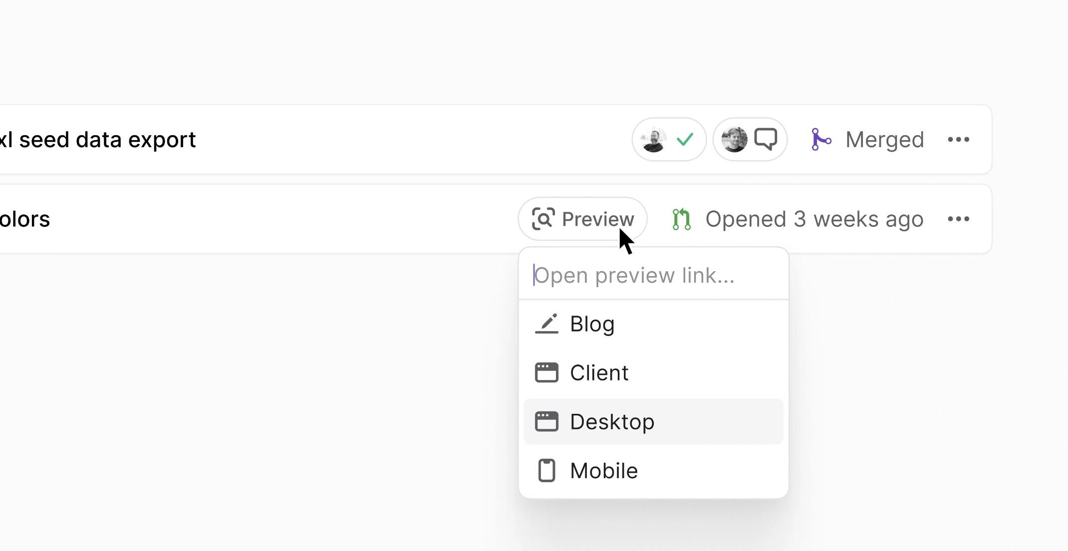 Multiple previews for a single PR are available in a dropdown menu, with customizable names and icons for easy identification (e.g. mobile and desktop previews). Icons are automatically chosen to reflect best their name, such as a mobile icon for mobile release links. Preview links are automatically removed after 30 days of inactivity on the PR.