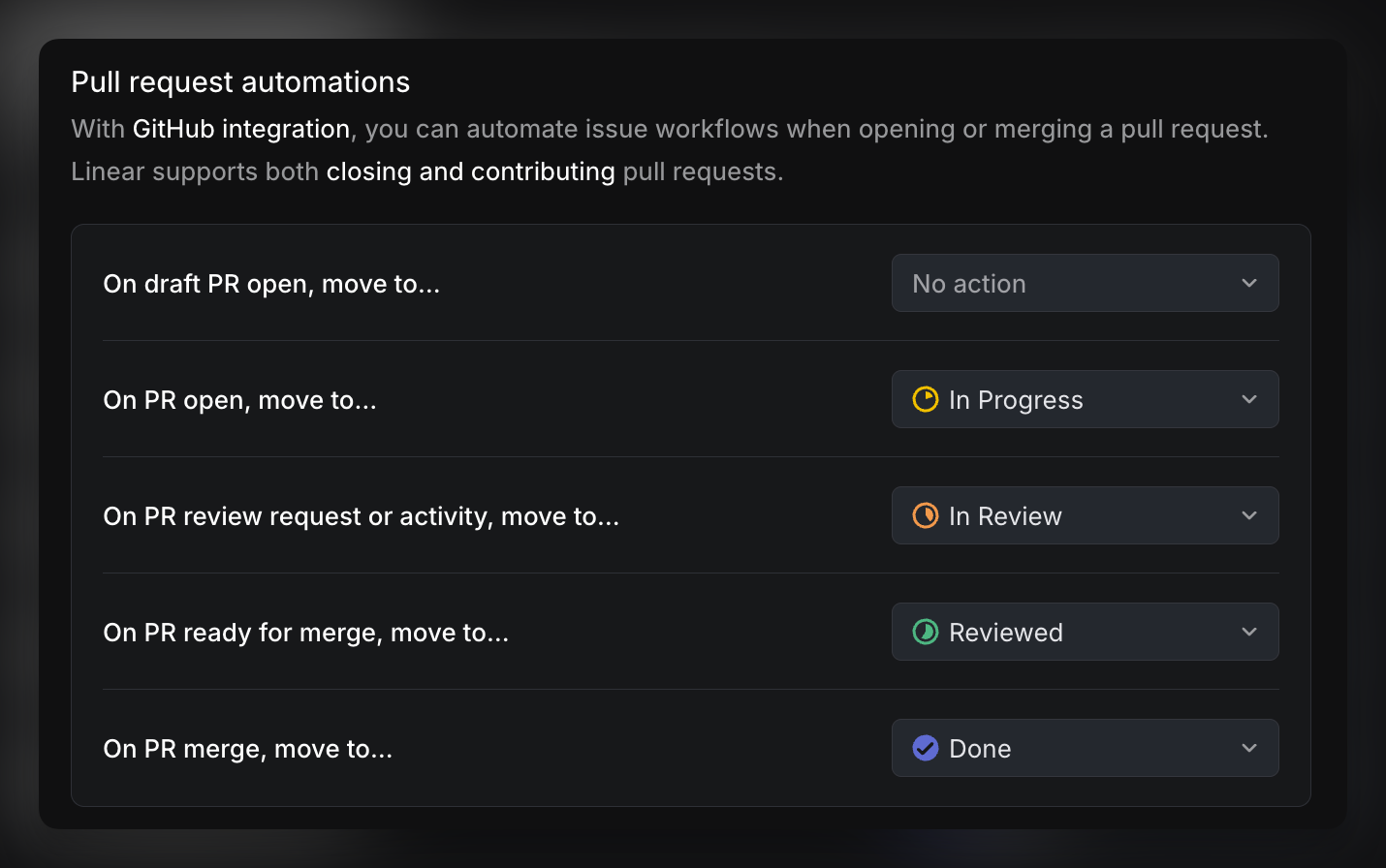Updates to PRs can automatically update the status of their linked Linear issues.