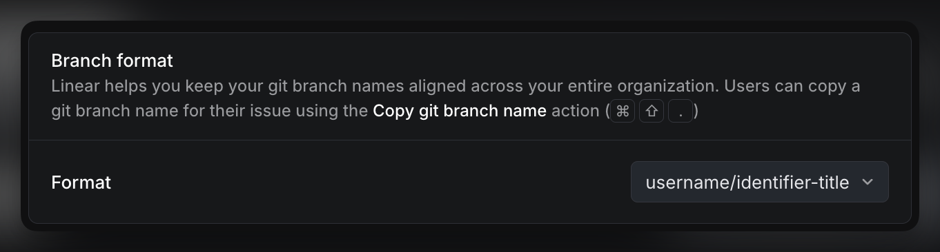 Select the branch format you want to use when copying the branch name using Cmd + Shift + . from a Linear issue and pasting it into your branch name.