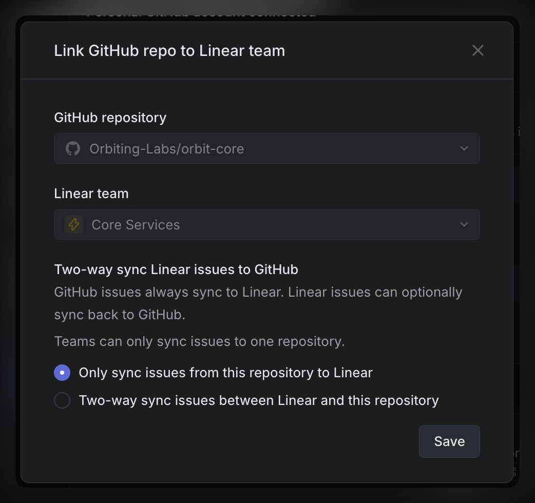 - Two-way: issues created in either the GitHub repo or Linear team will create a synced copy in the other software
