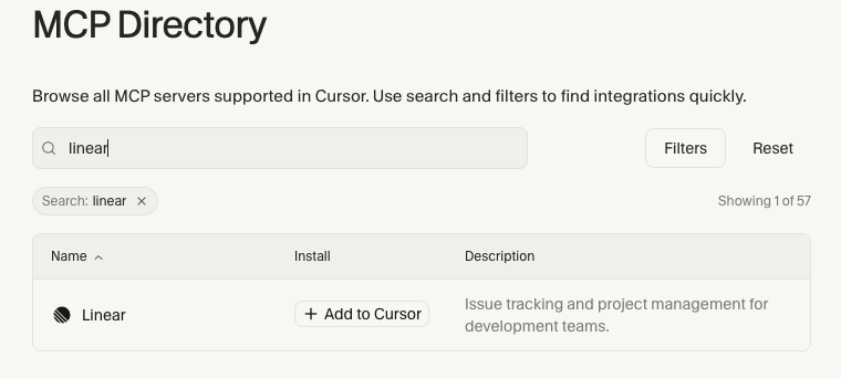 To add the MCP to Cursor, you can install by clicking here, or searching for Linear from Cursor's MCP tools page.
