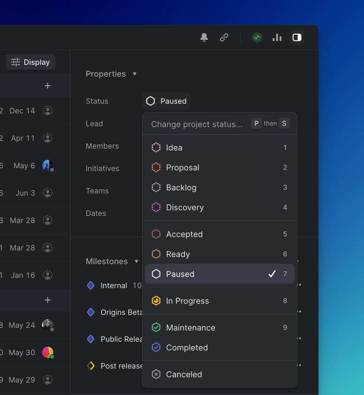Project statuses can have customized name, description, and color, which is configured in Settings -> Projects -> Statuses. You can have multiple statuses within the available project status categories: Backlog, Planned, In Progress, Completed, and Canceled.