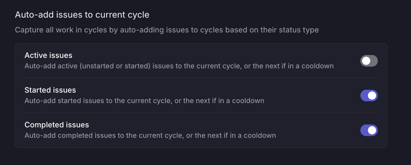 Auto-adding issues to a cycle helps to ensure all your work is captured by a cycle. You have the option to auto-add any Active, Started, or Completed issues that do not have a cycle assigned into the current cycle. If the current cycle is in cooldown, the issues will be added to the following cycle.